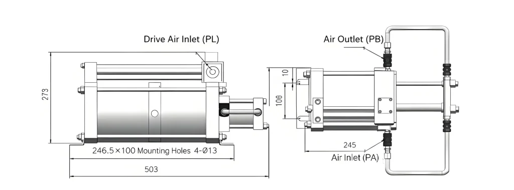 The Air Booster Pump is designed to work in environments where the original compressed air system is unable to meet the required pressure. This pump can increase the air pressure of the working system by 2 to 5 times, making it ideal for situations that need a boost in air pressure. The pump works by using compressed air from the existing system, and it is capable of operating continuously for extended periods of time without needing external power.